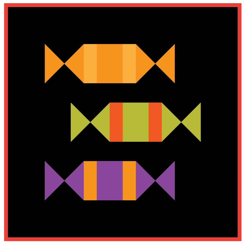 The Halloween-themed 12" Three treats block is a fast make and very scrap friendly! It uses hourglass blocks as the wrapper ends, and the best part is that it actually looks cute if they aren't perfect!