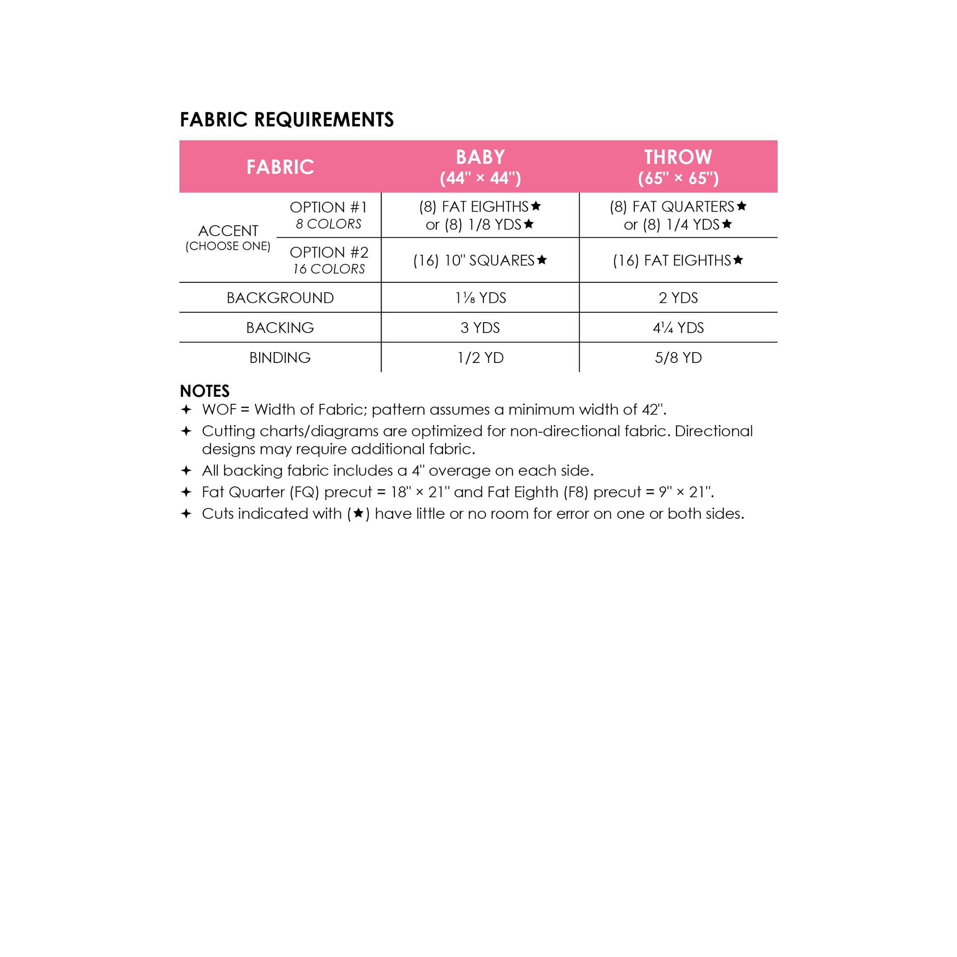 - Cutting charts/diagrams are optimized for nondirectional fabric. Directional prints may require additional fabric and a different cutting order.