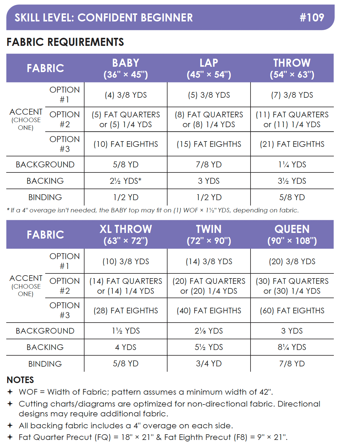 - Cutting charts/diagrams are optimized for nondirectional fabric. Directional prints may require additional fabric and a different cutting order.