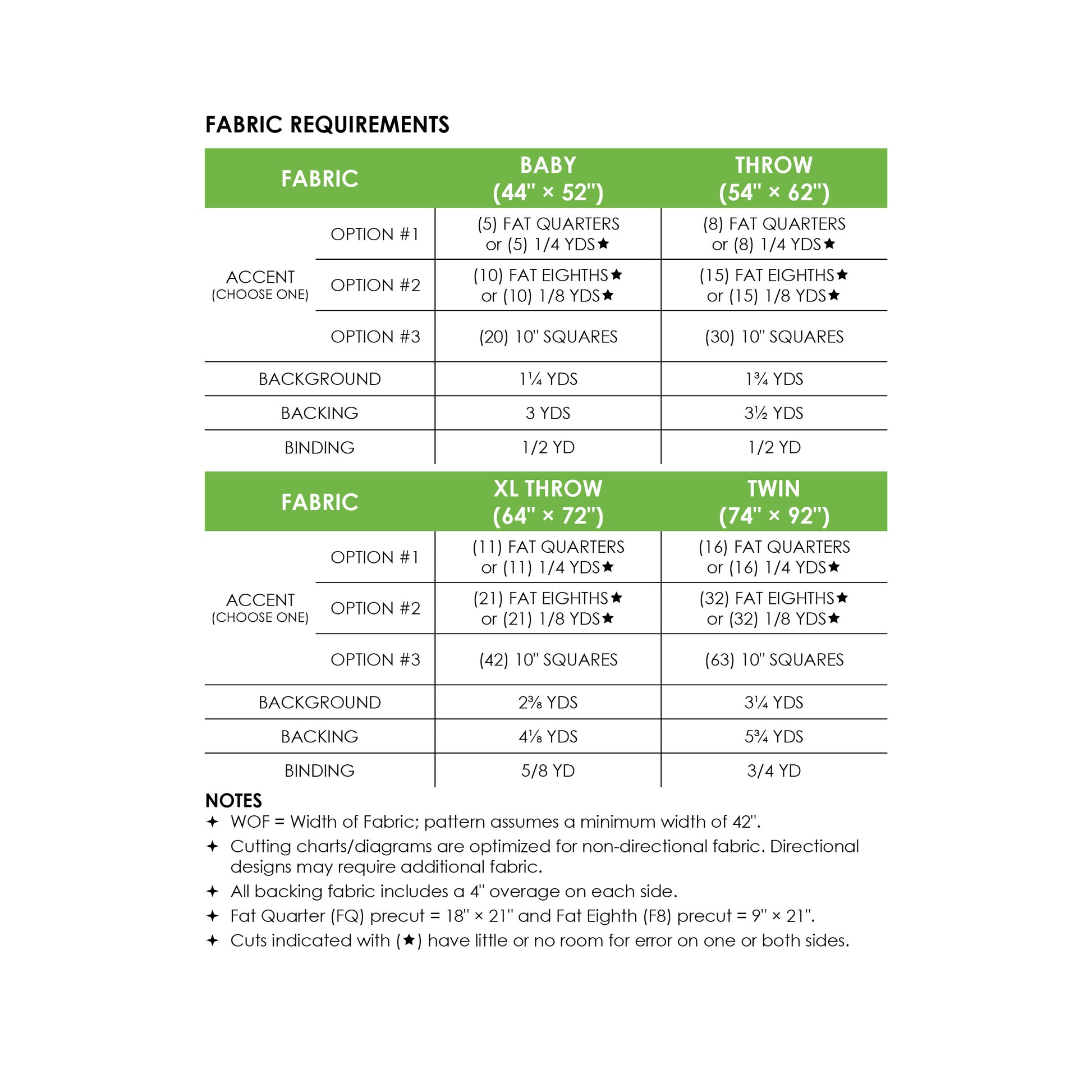 - Cutting charts/diagrams are optimized for nondirectional fabric. Directional prints may require additional fabric and a different cutting order.