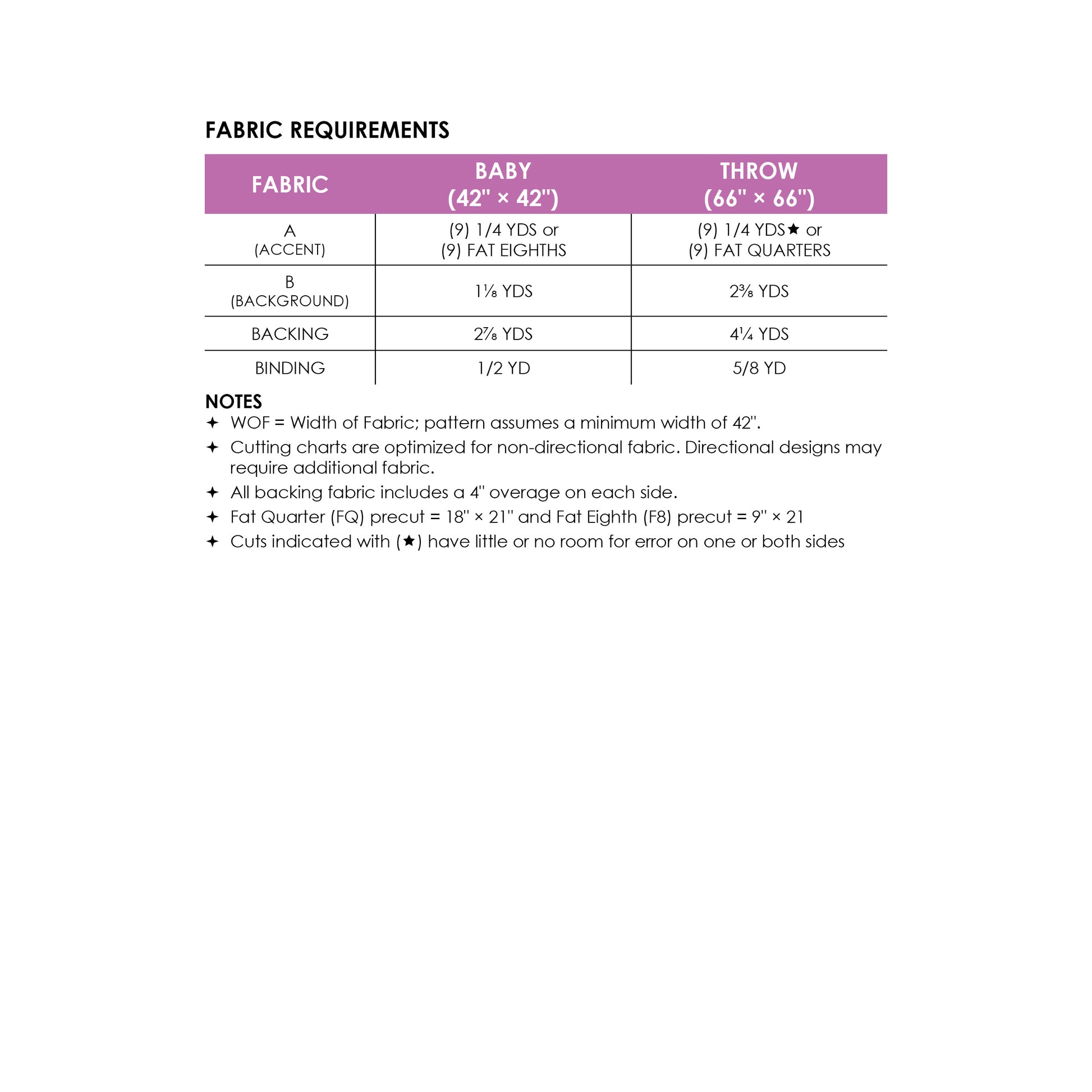 - Cutting charts/diagrams are optimized for nondirectional fabric. Directional prints may require additional fabric and a different cutting order.