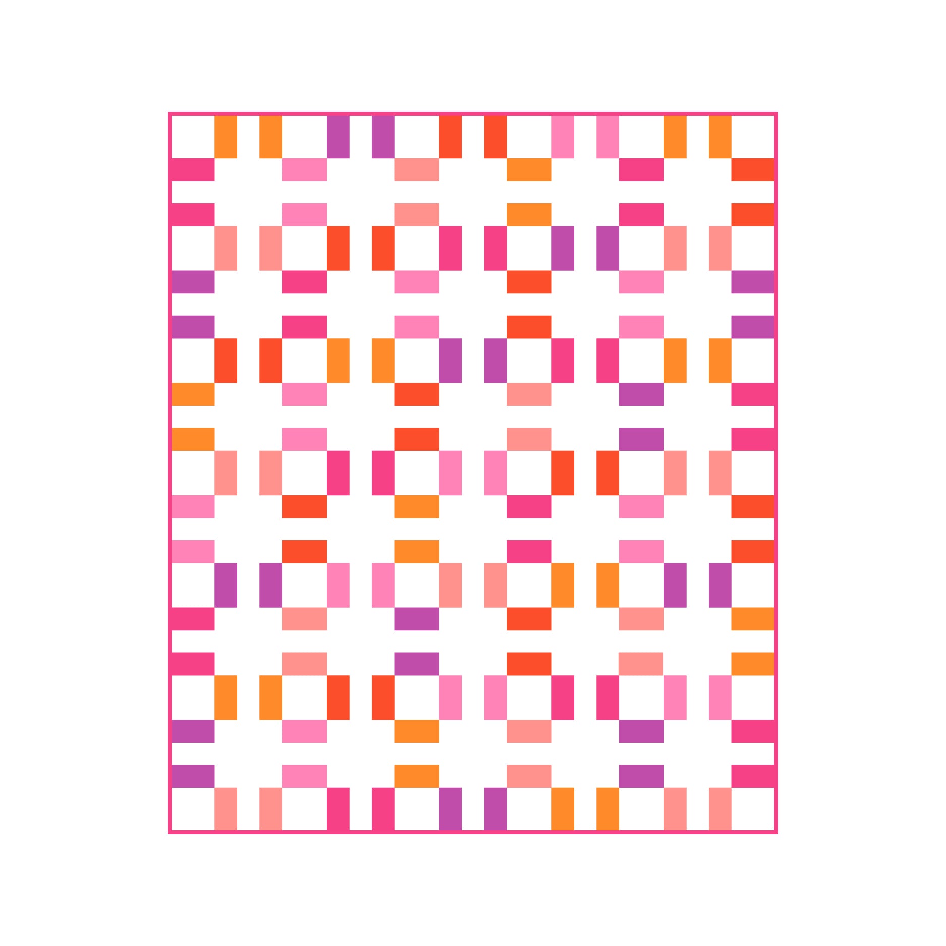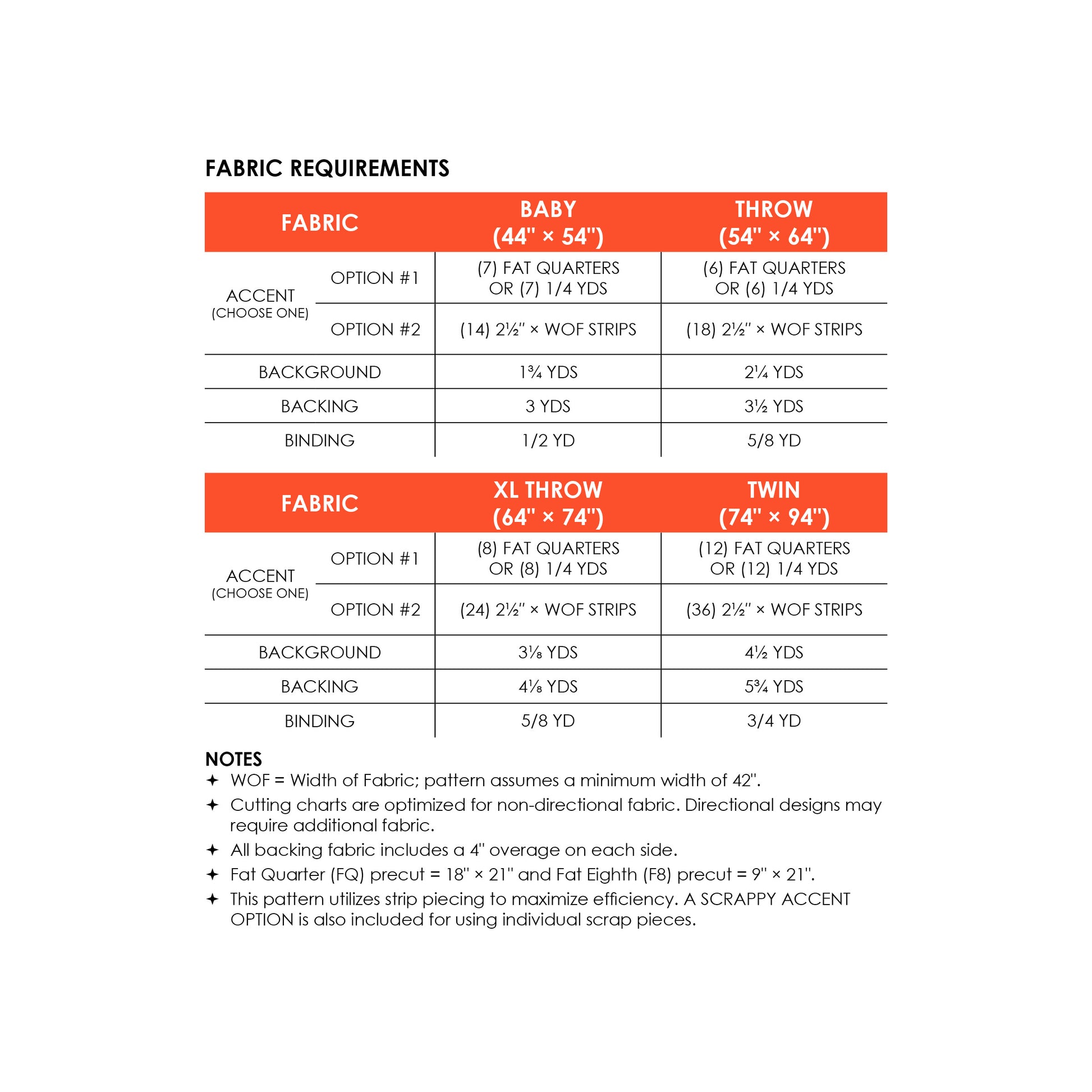 Twin Spin is a fun modern quilt pattern ready for your customization! It includes easy to follow diagrams for every step, and you can choose to use yardage, Fat Quarters, or a Jelly Roll for the accent fabrics!